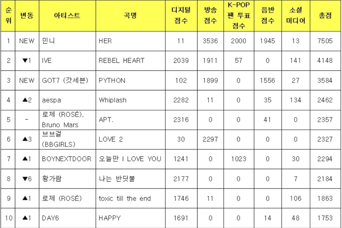 They posted the Music Bank chart on its official chart where (G)I-DLE’s Minnie claimed her first win for “HER,” which racked up a total of 7,505 points. The two other contestants, IVE’s “REBEL HEART,” and GOT70s “PHYTON” received 4,148 and 3,584 points respectively.
