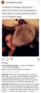 El público comenzó a especular que la relación actual entre Gigi y Zayn no es más que una “cortina” para el cantante promocionarse y permanecer vigente en los medios, pues le dedica cero promoción a su música, ni siquiera da entrevistas. Razón por la cual los haters difunden sus opiniones al respecto.