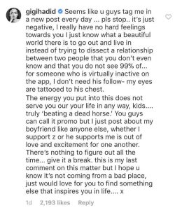 Tales rumores se intensificaron esta semana, al punto de hacer incomodar –y reaccionar- a Gigi. Ella dejó un comentario en una fotografía subida a Instagram pronunciándose sobre esta situación: