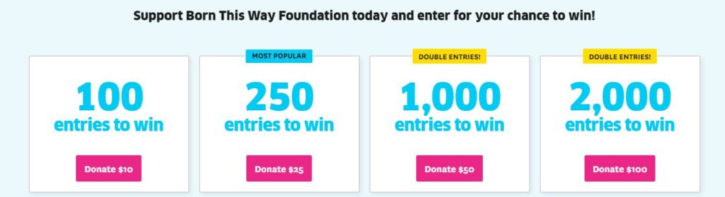 Empecemos por el positivo: Estarás apoyando a la Born This Way fundación, la cual se encarga o se compromete a apoyar el bienestar de los jóvenes y a empoderarlos para crear un mundo más amable y valiente, lograrás entrar en un sorteo para participar por el Lamborghini Huracán EVO RWD 2020.