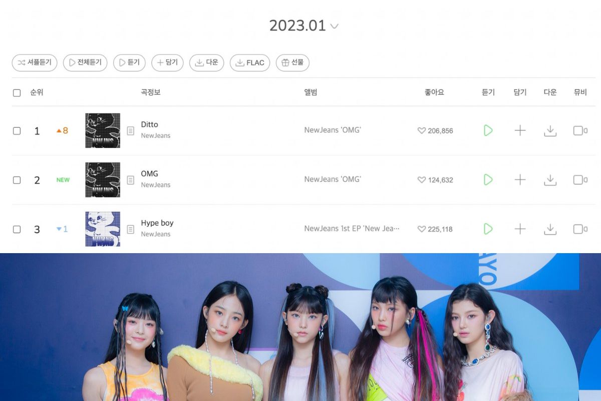 Melon, uno de los principales sitios de música y uno de los más grandes en corea, presentó recientemente su lista mensual del mes de Enero 2023, donde se puede apreciar a NewJeans ocupar los 3 primeros lugares del top 100, con su sencillo debut «Hype Boy» ocupando el puesto #3, «OMG» debutando en el puesto #2 y con su más reciente tema de prelanzamiento «Ditto» ocupando el primer puesto del top.
