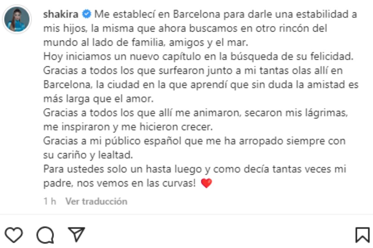 Ahora hace menos de una hora Shakira volvió a subir un post en su cuenta de Instagram, y aprovechó para dejar atrás todo lo malo y agradecer a los seguidores españoles el cariño y la fortaleza que le hicieron tener: «Me establecí en Barcelona para darles una estabilidad a mis hijos, la misma que ahora buscamos en rincón del mundo al lado de mi familia, amigos y el mar. Hoy iniciamos un nuevo capítulo en la búsqueda de su felicidad. Gracias a todos los que surfearon junto a mí tantas olas allí en Barcelona, la ciudad en la que aprendí que sin duda la amistad es más larga que el amor«, afirmó la colombiana.