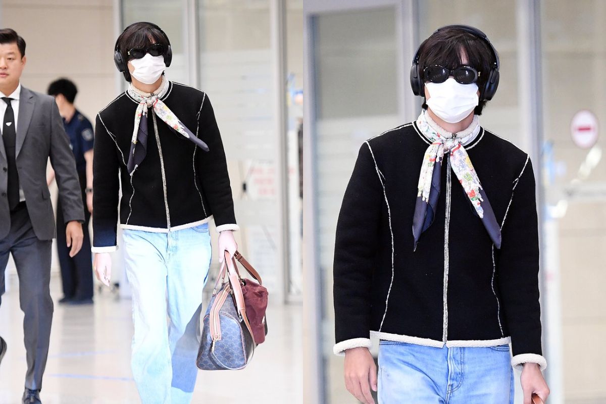Como siempre V se veía muy a la moda con su elegante bufanda, combinada con su blazer negro y unos jeans clásicos sueltos, sin duda reflejando comodidad y estilo al mismo tiempo, este fresco estilo ha hecho que Kim Taehyung se convierta en la persona del momento, pues la cantidad de fanáticos que esperaban su llegada era inimaginable.