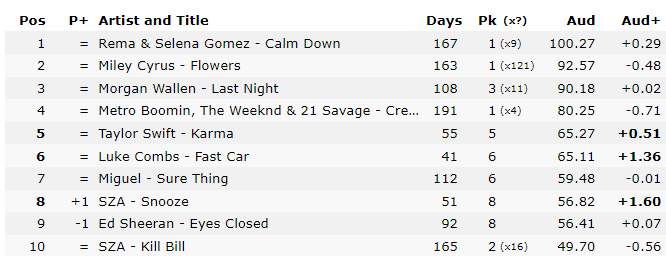 ¿En qué posicion radial está Calm Down de Rema y Selena Gomez?