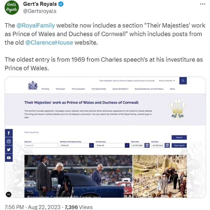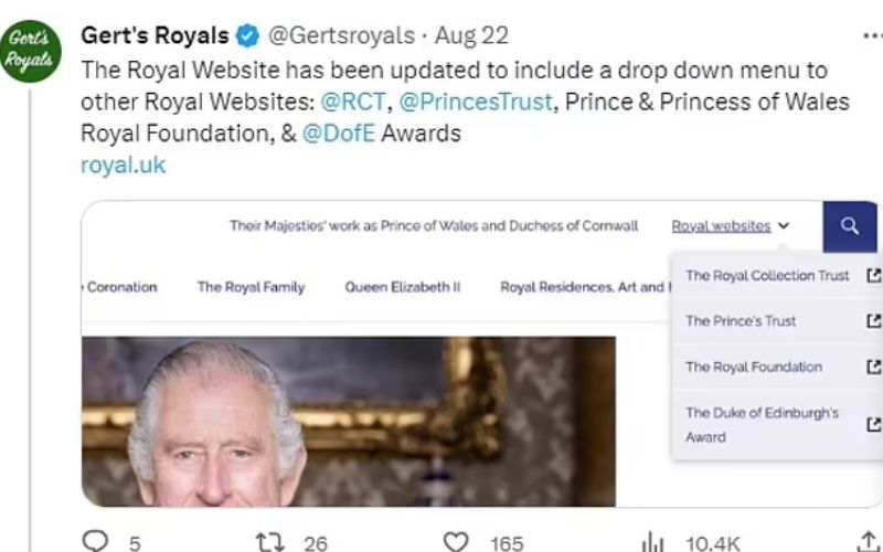 Tras la muerte de la reina Isabel II, la institución se ha encontrado editando y agregando nuevos informes a la web real, en donde a duras penas se podía leer el nombre de la reina Camilla Parker, por lo que estos han eliminado varios artículos y títulos del duque de Sussex, acciones que los fanáticos de la realeza han criticado, puesto que se siente como la reina Camilla Parker sustituye poco a poco al príncipe Harry.