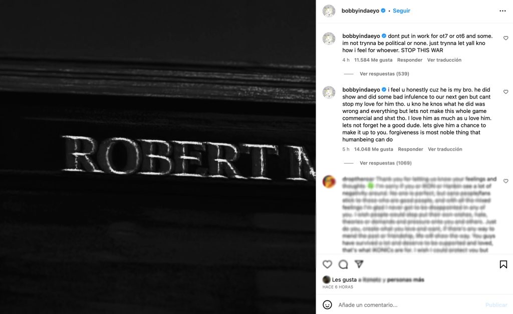 Fue a través de un comentario en su cuenta oficial de Instagram con el que Bobby ha hablado por primera vez sobre sus problemas con B.I, dejando en claro que ya no quiere tener ningún tipo de enemistad o problema con él.
