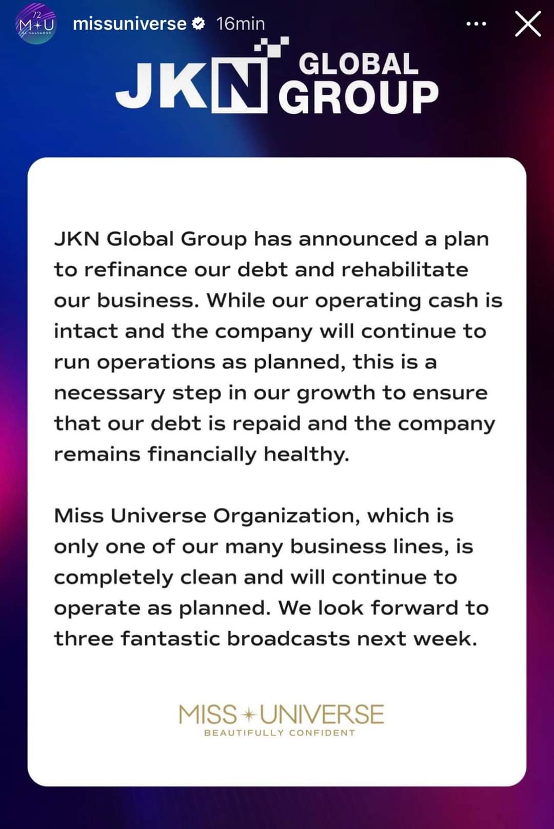 «La Organización Miss Universo, que es solo una de nuestras muchas líneas de negocio, está completamente limpia y continuará funcionando según lo planeado. Esperamos con ansias tres transmisiones fantásticas la próxima semana», concluía.