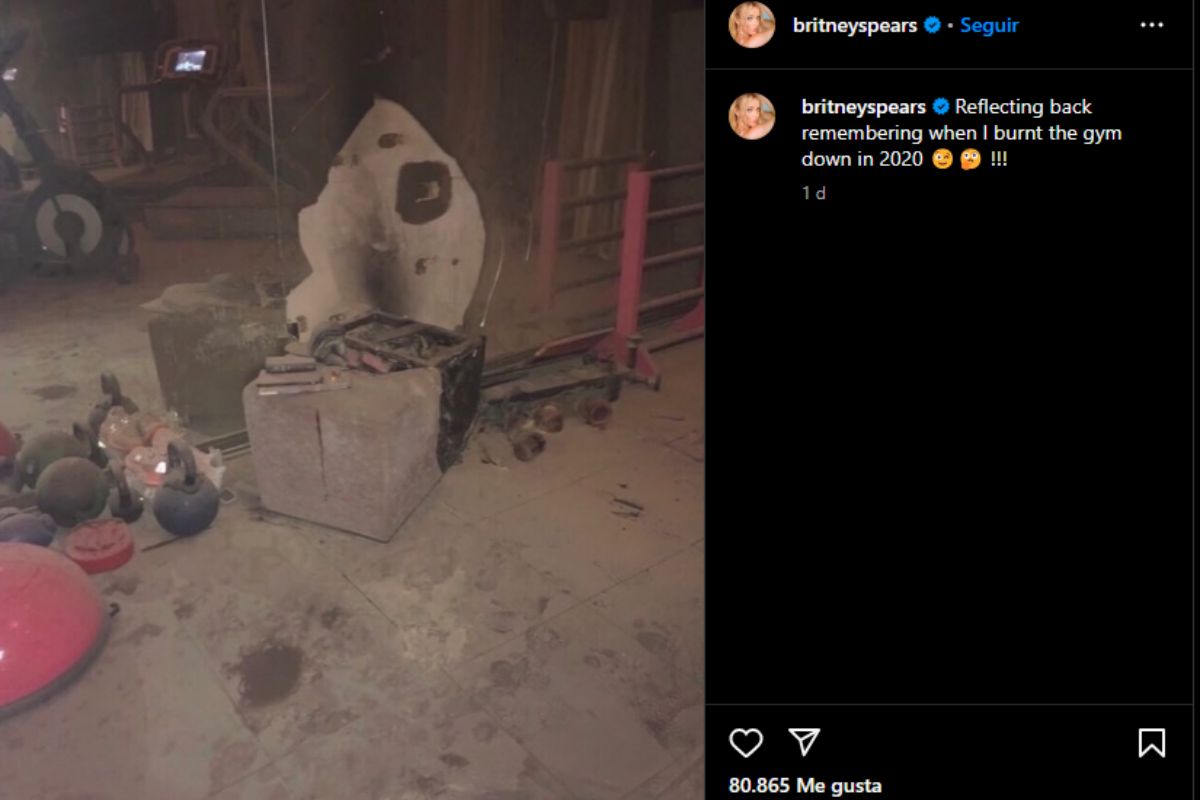 Por medio de su Instagram personal, @britneyspears, la artista publicó una fotografía de lo que quedaba de su gimnasio totalmente consumido en llamas y lleno de cenizas, con un mensaje que decía ‘reflexionando cuando quemé el gimnasio en el año 2020‘. En la imagen se pueden observar las mancuernas, las pesas, algunas bicicletas y todo el equipo totalmente consumido en llamas, sin embargo, y aunque las perdidas fueron un poco grandes, Britney Spears agradeció porque el momento no pasó a mayores y nadie resultó lastimado, igualmente reveló a modo de chiste, que le gusta más hacer ejercicio en el aire libre.