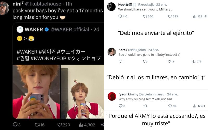 Los usuarios de la red social X, comenzaron a hacer chistes y a acosar a Kwon con bromas como, «eres perfecto para reemplazar a tu papá V en el ejército» o «Alista tus cosas muchacho, tengo una misión de 17 meses para ti», por supuesto la mayoría del ARMY no estuvo de acuerdo con el trato y el acoso que estaba sufriendo el chico.