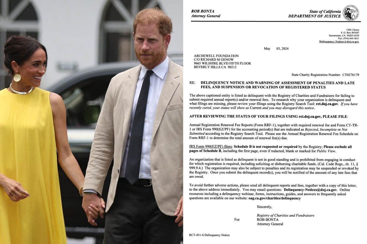 El 3 de mayo, Bonta emitió un aviso de morosidad en nombre del Registro de organizaciones benéficas y de recaudación de fondos para la fundación ‘Archewell’. Según el documento publicado primeramente por el diario ‘Page Six‘, la organización se incluyó en la lista de «morosa» tras no haber presentado los informes anuales requeridos.