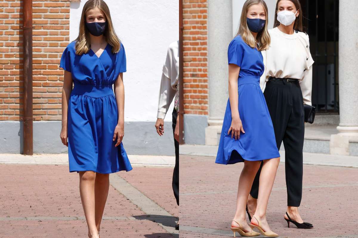Para su pasado gran día, la hija mayor de los reyes de España eligió un vestido en tono azul, un color que ha estado presente en grandes citas en su vida. Para ser más exactos, la princesa Leonor optó por un diseño que contaba con hombros relajados, escote en pico, falda hasta la rodilla y mangas cortas de la casa de moda Caroll, que para ese entonces tenía un valor de mercado de entre 150 a 90 euros (162 a 97 dólares).