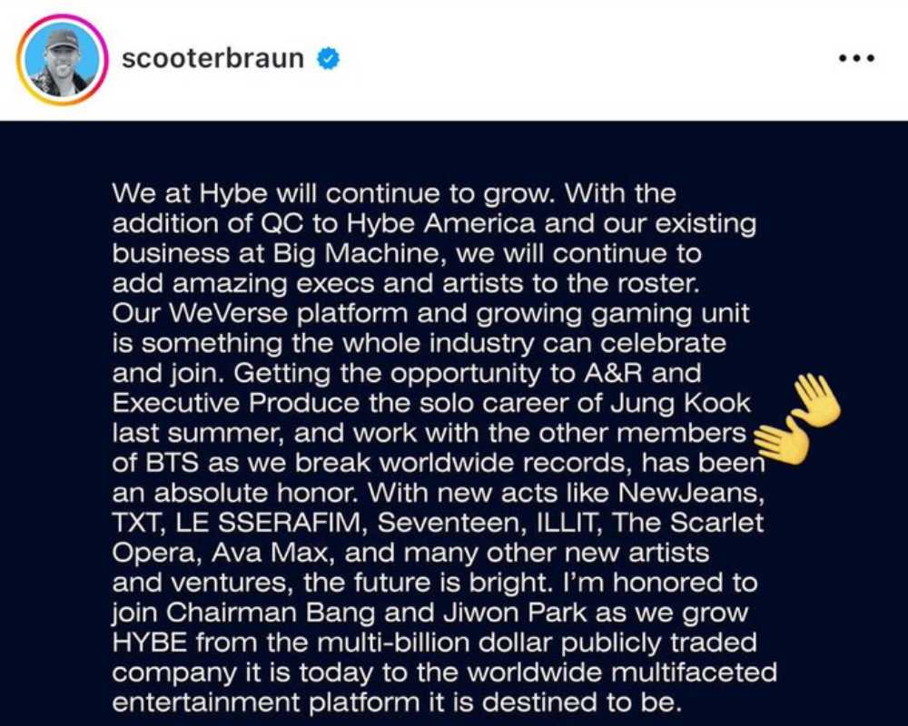 «Nuestra plataforma Weverse y nuestra creciente unidad de juegos es algo que toda la industria puede celebrar y a lo que puede unirse. Tener la oportunidad de ser A&R y productor ejecutivo de la carrera en solitario de Jung Kook el verano pasado, y trabajar con los demás miembros de BTS mientras batimos récords mundiales, ha sido un honor absoluto. Con nuevos artistas como NewJeans, TXT, LE SSERAFIM, Seventeen, ILLIT, The Scarlet Opera, Ava Max y muchos otros, el futuro es brillante.» Dictó Scooter