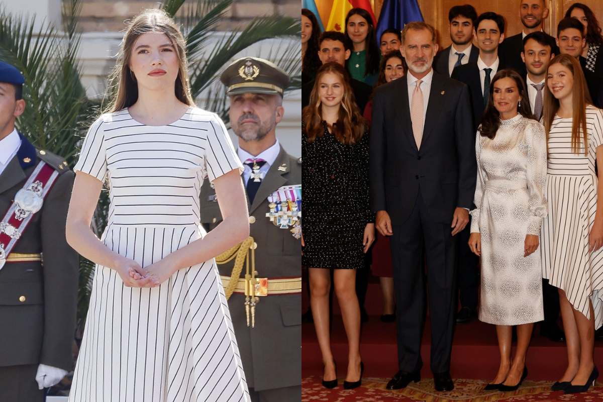 Así es, en vez de estrenar un nuevo outfit, quiso rememorar otro de los días especiales de su hermana, un hermoso vestido blanco con rayas delgadas de color negro firmado por Hugo Boss, que no solo le dio una sensación de frescura en el asoleado día, sino que también la hizo lucir sensacional, pareciera que la reina Letizia la ha estado influenciando en la manera de vestir.