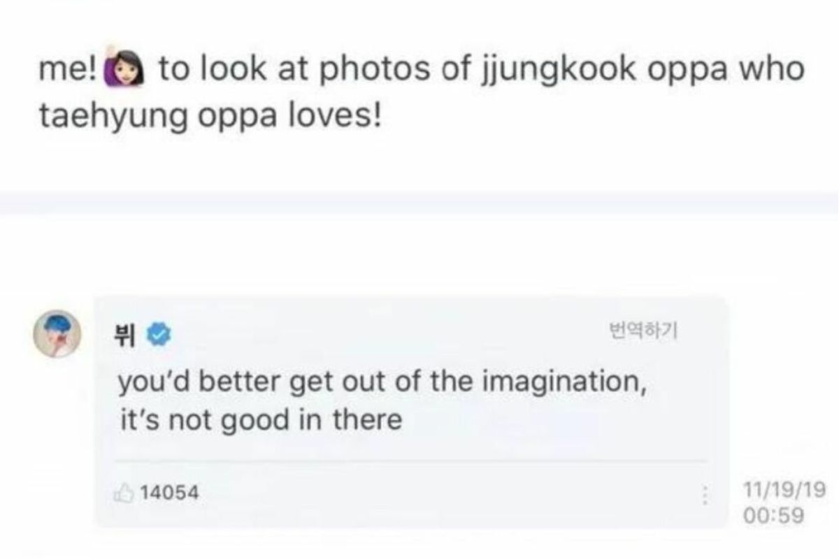 3. Taehyung y Jungkook siempre han sido objetivo de shipeos por parte de las fanáticas más fantasiosas del fandom, quienes han creado innumerables relatos e historias entre ambos, sin embargo, V de BTS respondió a una de estas alocadas peticiones diciendo que saliera de su imaginación.
