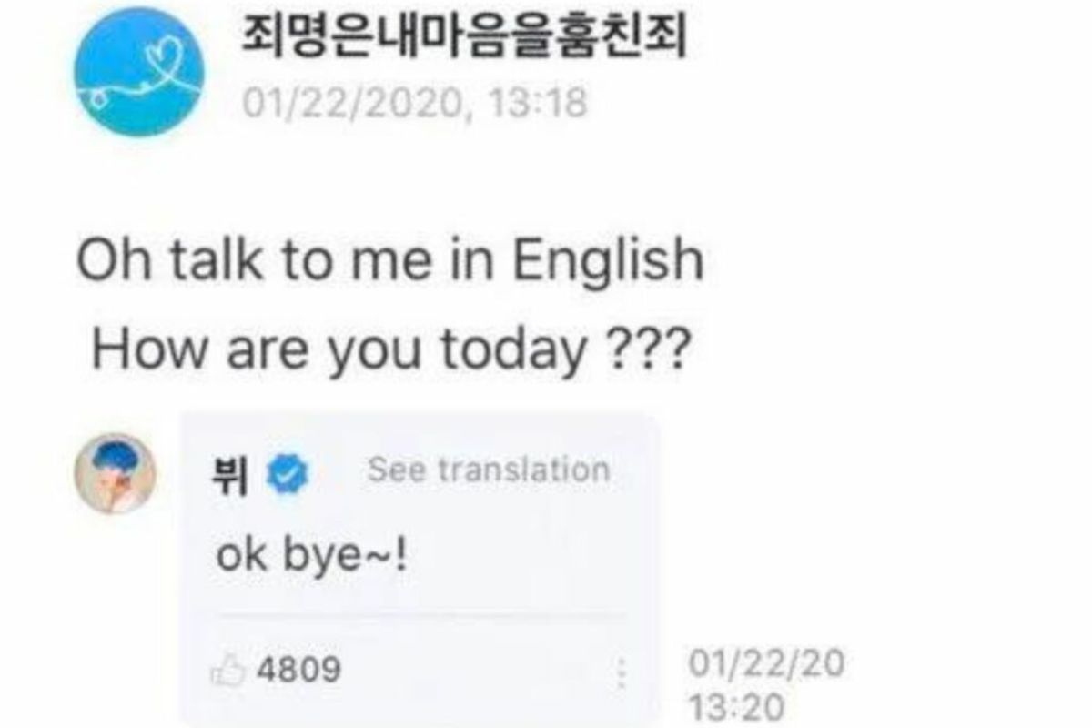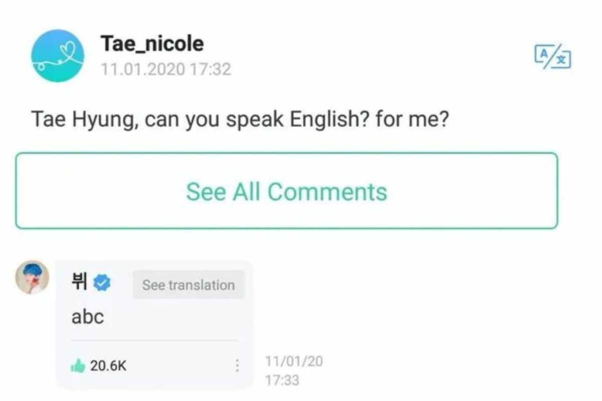 5. El ARMY no aprende, y V tiene muchas cómicas respuestas para todos los fans que le piden hablar en inglés, y en esta otra ocasión, el Idol accedió a hacerlo, «abc» respondió Taehyung.