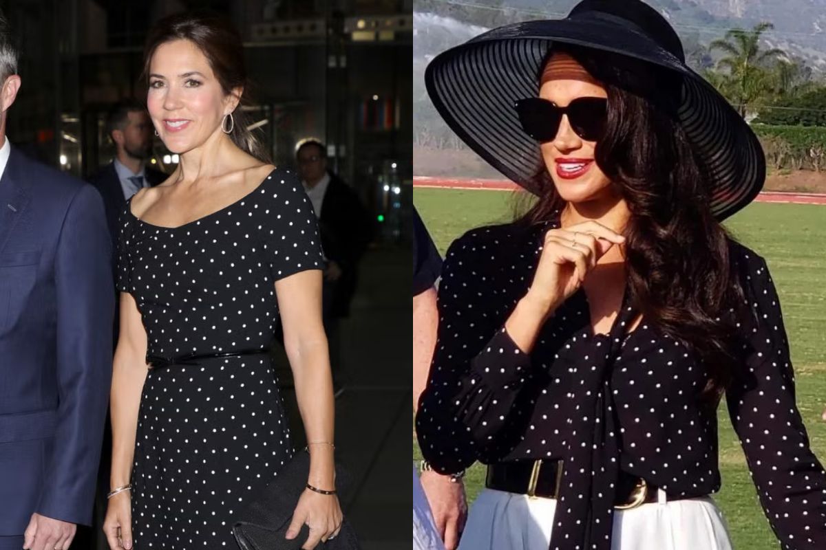 5. Meghan Markle: La duquesa de Sussex también ha mantenido vigente la tendencia del estampado de su suegra, pues en un partido de polo de 2022, la esposa de Harry se mostró sofisticada con una elegante blusa de lunares con lazo en el cuello de Celine que combinó con panalones blancos cortos, un sombrero y tacones de Aquazzura.