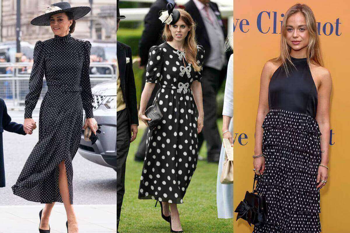 3. Señora Amelia Windsor: Conocida como una fashionista, en una exposición en mayo de 2023 se mostró cautivadora, llevando un corpiño de satén negro y una falda escalonada hasta el tobillo con pequeños lunares blancos, demostrando que el estampado seguía vigente.