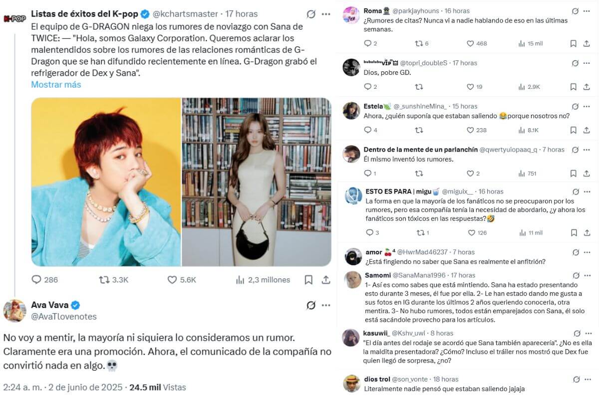 «Literalmente nadie pensó que estaban saliendo, jajaja«, «¿Rumores de citas? Nunca vi a nadie hablando de eso en las últimas semanas«, «Él mismo inventó los rumores«, «1- Así es como sabes que está mintiendo. Sana ha estado presentando esto durante 3 meses; fue por ella. 2- Le ha estado dando me gusta a sus fotos en IG durante los últimos 2 años queriendo conocerla, otra mentira«, «¿Está fingiendo no saber que Sana es realmente el anfitrión?«.