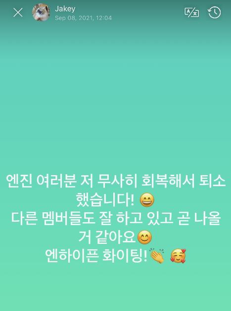 Now, ENGENEs will be happy to learn that Jake has recovered from COVID-19. On August 8, nine days after his positive test result, Jake announced on Weverse that he has “recovered safely” and has now been discharged from the treatment center where he was being monitored.