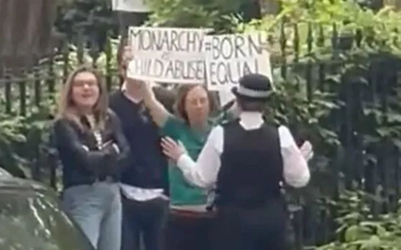 Even a police officer was required to approach the woman holding numerous posters reading “#Born Free” and “Monarchy is child abuse” in order to speak with her, according to Royal reporter Palmer, who described the unplanned event as a “small republican protest.”