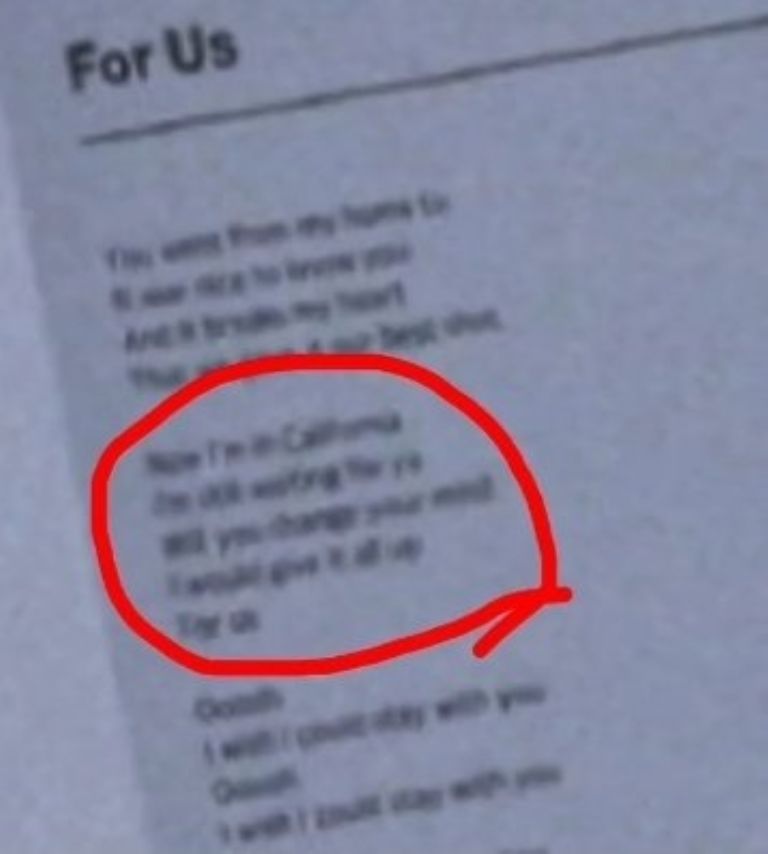 “Now I’m in California, I’m still waiting for you. Will you change your mind? I would leave everything for us. I wish I could stay with you“, reads part of this possible song in one of the leaked images.
