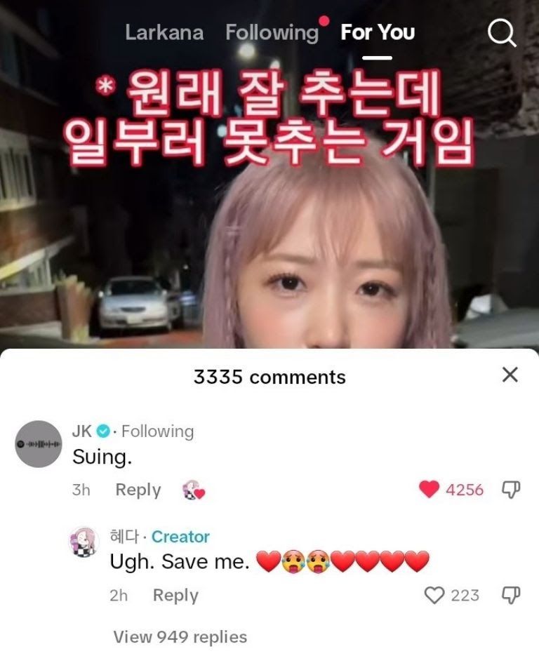However, what caught the most attention was not her video or her dance steps, but rather that she subtitled the tiktok with the phrase “Jungkook-nim will you be suing me..?” Given this and surprisingly, the BTS member responde