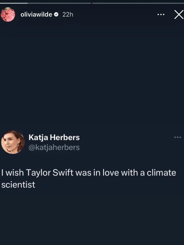 On her official Instagram account, Wilde, Harry Styles’ most recent ex, shared a Twitter user’s post where it said “I wish Taylor Swift was in love with a climate scientist“, hinting that this trend could be aimed at more constructive situations such as climate change.