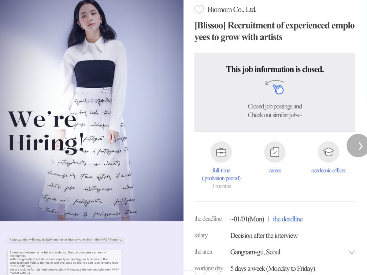 Everything seems to indicate that they are recruiting staff, because with a picture of Jisoo and the new name ‘BLISSOO‘, they announced that their goal is to expand as much as possible in the national and international market, so they are looking for skilled employees to start this new project.