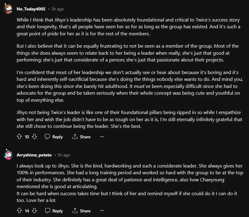Despite the struggles, Jihyo continued to lead TWICE and is responsible for hearing all the other 8 voices in the group. After that, she takes the opinions and feelings of the whole group and gives them to JYP Entertainment. As a result, fans quickly sent waves of support and praised her for her role and resilience.