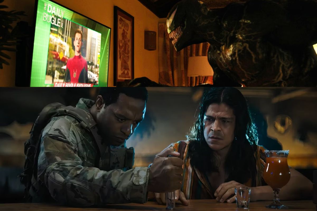 The trailer appears to continue the bar scene, but in Sony’s Venom universe, the same bartender who spoke to Eddie in the post-credits scene can be seen in it, but also a soldier (by the actor Chiwetel Ejiofor from the Sony universe) arrives at the establishment and captures the piece of Venom in a jar and takes it away, causing great confusion.