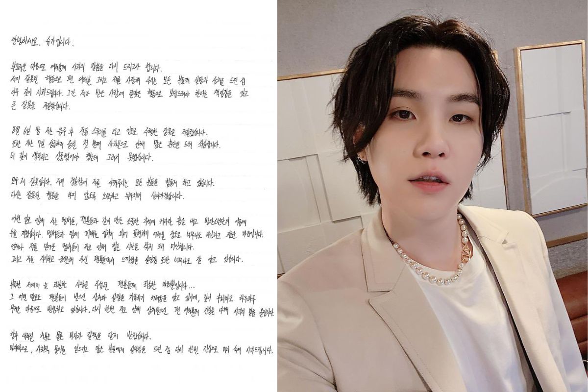 After his recent public appearance at Yongsan Police Station, BTS member Suga shared a handwritten apology following the drunk driving incident, expressing his regret for the controversy, disappointment, and confusion he has caused the last few weeks.
